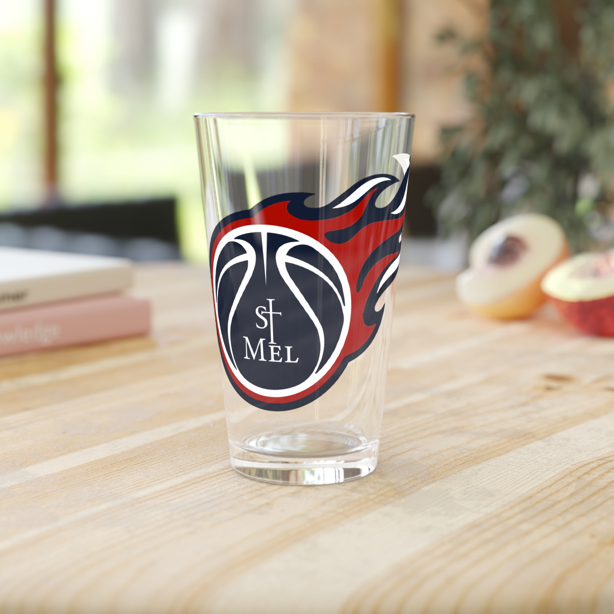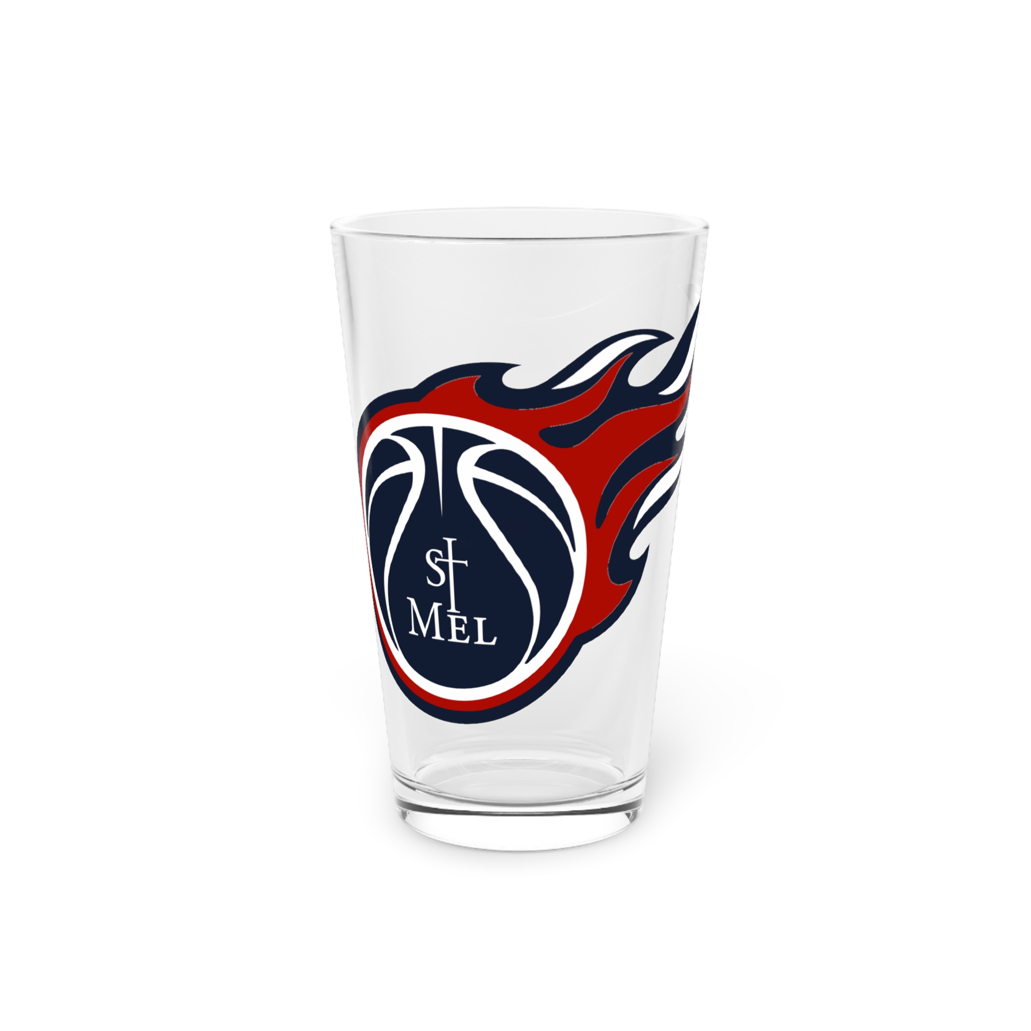 Crafted from premium, durable glass, this pint glass is built to last. It holds 16 ounces of your favorite beverage, making it perfect for soda, water, or a post-game brew. The clear glass highlights your drink while showcasing the bold St. Mel Basketball graphic, designed to stay vibrant and sharp even after multiple uses and washes. Enjoy a glass that’s as resilient and spirited as your favorite team.